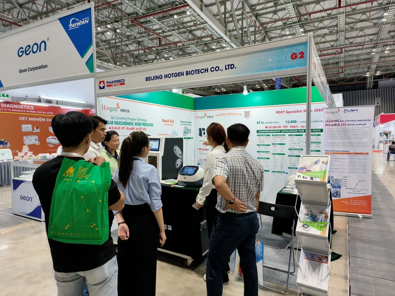 Beijing Hotgen Biotech Co., Ltd. (Hotgen) successfully participated in the 2024 Pharmed & Healthcare Vietnam Exhibition during September 11-14th, 2024. This is the debut of Hotgen’s products in Vietnam exhibition. During this event at the Saigon Exhibition and Convention Center (SECC) in Ho Chi Minh City, Hotgen presented its highly regarded mono-test chemiluminescence (CLIA) and Up-Converting Phosphor Technology (UPT) immunoassay solutions, along with its breakthrough small-molecule diagnostic technology and a range of colloidal gold rapid test products. These innovative diagnostic products attracted numerous attendees and received high praise from industry experts. During the exhibition, we engaged in in-depth discussions with local professionals, exploring the potentials of innovative in-vitro diagnostic (IVD) technologies in enhancing diagnostic capabilities in Vietnam and across the South-East Asian region. Pharmed & Healthcare Vietnam 2024 provides a valuable opportunity for Hotgen to connect with the diagnostic industry in the region. We look forward to furthering collaborations with partners to advance healthcare solutions, for a healthier Vietnam, for a healthier world.